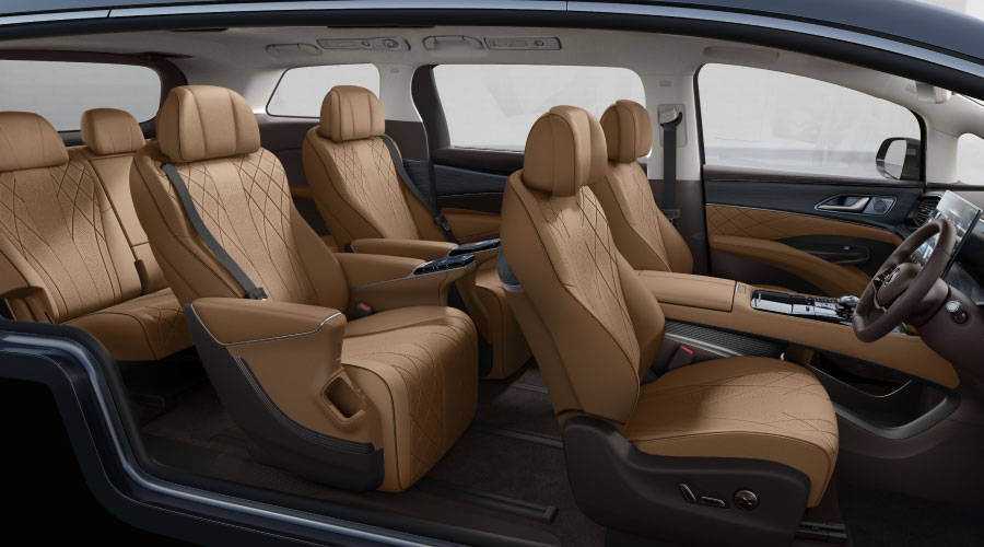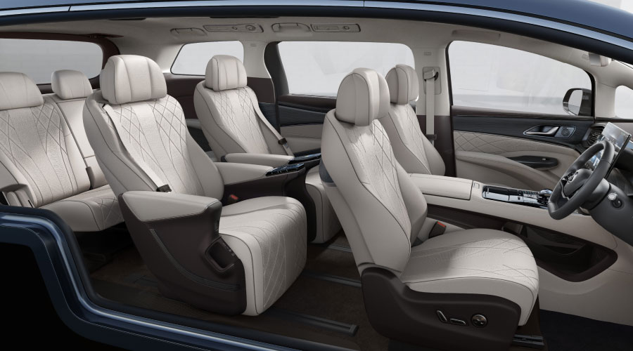 Masuk ke dalam interior, terdapat layar head unit ultra- high-definition sebesar 15,6 inci. Panel instrumen MID sebesar 10,25 inci, memberikan informasi pengemudi mulai dari navigasi, peringatan, mode berkendara, status baterai hingga informasi penting mengenai kendaraan lainnya. Sebagai poin unik di kelas MPV 7-seater.